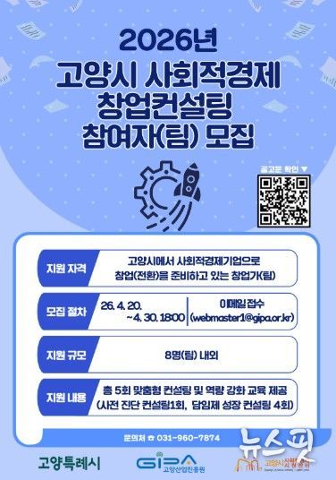 (뉴스핏 = 김수진 기자) 고양산업진흥원이 운영하는 고양시사회적경제지원센터가‘2026년 고양시 사회적경제 창업컨설팅 사업’에 참여할 예비 창업자(팀)을 오는 30일까지 모집한다.