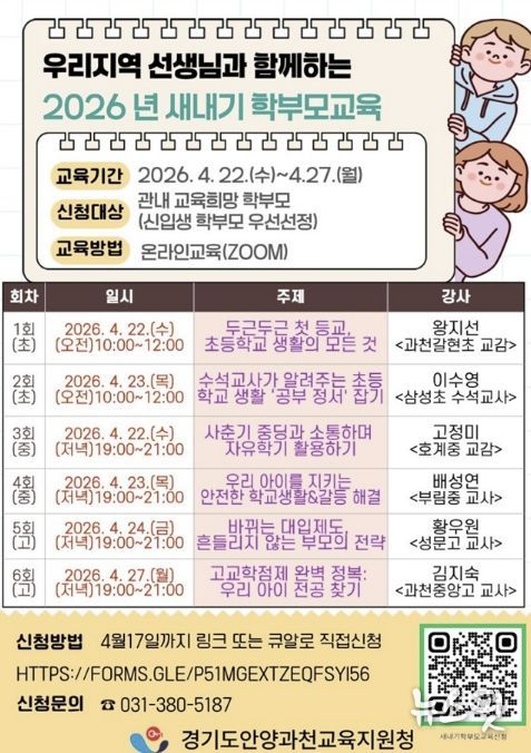 (뉴스핏 = 김수진 기자) 경기도안양과천교육지원청은 오는 4월 22부터 27일까지 관내 신입생 학부모를 대상으로 ‘우리지역 선생님과 함께하는 2026년 새내기 학부모 교육’을 개최한다.