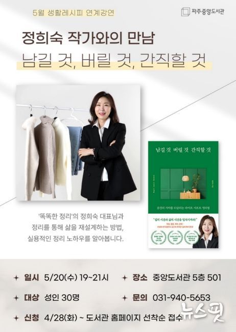 (뉴스핏 = 김호 기자) 파주시 중앙도서관은 오는 5월 20일 19시, 정리 전문가 정희숙 작가를 초청한 '남길 것, 버릴 것, 간직할 것' 강연을 개최한다.