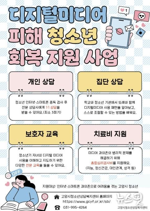 (뉴스핏 = 김호 기자) 고양시청소년재단 산하 고양시청소년상담복지센터는 디지털 유해환경에 의한 청소년의 디지털 과의존 및 사이버 도박 등의 사회문제를 예방하고 치료하기 위해 오는 5월부터 12월까지 ‘디지털미디어 피해 청소년 회복 지원 사업’을 운영한다고 밝혔다.