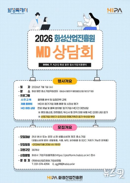 (뉴스핏 = 김수진 기자) 화성산업진흥원(원장 전병선)은 화성시 생활소비재 기업의 대형 유통망 진입과 신규 판매채널 확보를 지원하기 위해 ‘2026년 화성산업진흥원 MD 상담회’를 개최하고, 오는 5월 20일까지 참여기업을 모집한다.