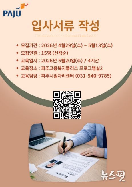 (뉴스핏 = 김호 기자) 파주시는 중장년 구직자의 원활한 노동시장 재진입을 돕기 위해 ‘입사서류 작성 실습 교육’참여자 15명을 모집한다.