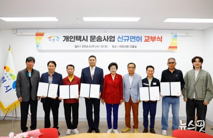 (뉴스핏 = 김호 기자) 이천시는 29일 시청 다올실에서 개인택시운송사업 신규 면허증 교부식을 개최하고, 심사를 통해 최종 선정된 5명의 대상자에게 면허증을 전달했다고 밝혔다.