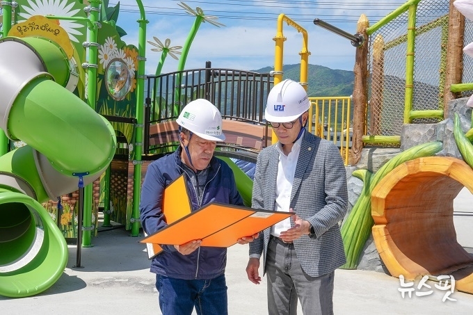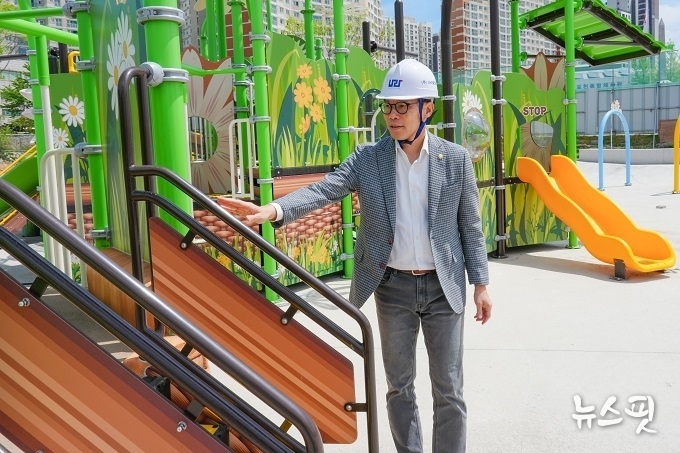 이와 함께, 어린이 낙상사고 방지를 위한 바닥 탄성 포장 공사 계획도 점검했다. 임종훈 의장은 구역별 최대 95mm 두께로 시공되는 고무칩 포장 공정을 확인하고, “단 한 명의 아이도 다치는 일이 없도록 공사의 완성도를 높여야 한다”라고 당부했다.