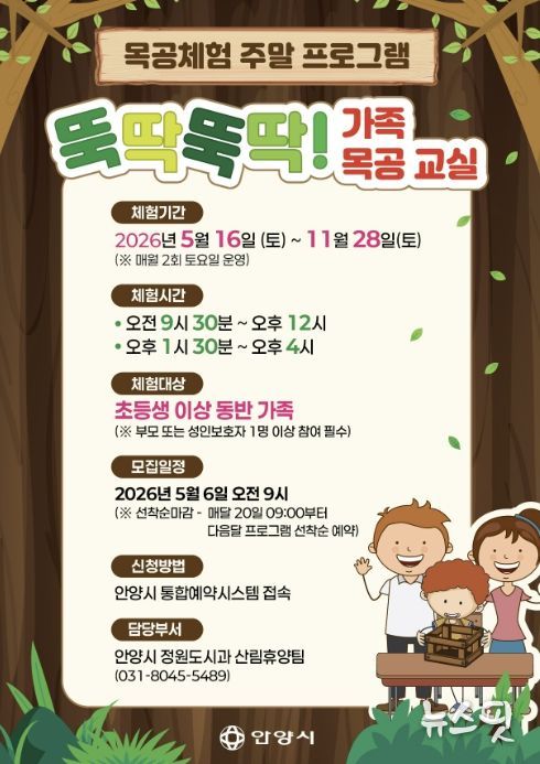 (뉴스핏 = 김수진 기자) 안양시는 초등학생과 가족이 함께 참여할 수 있는 목공체험 주말 프로그램인 ‘뚝딱뚝딱! 가족 목공 교실’을 운영한다고 30일 밝혔다.