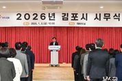 (뉴스핏 = 김호 기자) 김포시가 2일 오전 10시, 시청 본관 3층 대회의실에서 ‘2026년도 시무식’을 열고 붉은 말 병오년(丙午年) 새해의 힘찬 출발을 알렸다. 이날 시무식에는 김병수 김포시장을 비롯해 실·국·소장, 부서장 등 간부 공직자 100여 명이 참석해 새해 시정 운영 방향을 공유하고, 시민 중심의 시정 추진과 새로운 도약을 향한 결의를 다졌다. 행사는 국민의례를 시작으로 공무원 헌장 낭독, 신년사 순으로 차분하고 엄숙하게 진행됐으며, 참석자들은 시무식을 통해 공직자로서의 사명과 책임을 다시 한 번 되새기는 시간을 가졌다. 김병수 김포시장은 신년사에서 “붉은 말의 해는 뜨거운 열정과 강한 추진력을 상징한다”며 “올해는 이 기운을 받아 ‘시민의 상상이 현실이 되는 김포’를 시민 한 분 한 분이 실제로 느낄 수 있도록 시정 역량을 집중해 나가겠다”고 밝혔다. 아울러 “속도감 있는 행정과 책임 있는 실천으로 김포의 미래 경쟁력을 더욱 높여 나가겠다”고 덧붙였다. 한편, 시무식을 마친 뒤 참석자들은 서로 새해 인사를 나누며 올 한 해 시정 운영에 대한 각오를 공유하는 시간을 가졌으며, 시민과