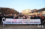(뉴스핏 = 김수진 기자) 의정부시의회는 지난 1일 병오년 새해를 맞아 지역 주민들과 함께 걸으며 희망찬 2026년을 시작할 수 있도록 ‘해맞이 산책, 하천길 따라 새빛정원까지’ 신년 해맞이 행사에 참석했다. 이번 행사는 ▲호원 생활체조광장에서 출발해 ▲신의교~신곡교 중간지점 벽천분수 ▲동오역 생활체조광장 ▲경기도청 북부청사역 인근 벽천분수를 거쳐 ▲신곡새빛정원까지 이어지는 릴레이 산책 코스로 진행됐다. 해맞이 행사에는 시민들과 함께했으며, 15개 동 통장협의회가 행사 준비와 운영에 참여해 중랑천, 부용천 산책로를 걸으며 새해에도 시민들과의 공동체 의식을 함양하고자 마련됐다. 김연균 의장을 비롯한 권안나 부의장과 의정부시장, 의정부시통장협의회 등이 참석했다. 행사에 참석한 의원들은 “희망과 도약을 상징하는 붉은 말의 해를 맞아 시민들과 첫 해맞이를 함께하게 되어 더없이 기쁘다며” “올 한 해 더욱 시민들의 목소리에 귀 기울이고 함께 공감·소통하며, 의정부시의 발전을 이끄는 의정부시의회가 되도록 노력하겠다”고 전했다.