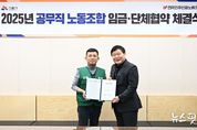 (뉴스핏 = 김수진 기자) 시흥시는 지난 26일 시청 다슬방에서 교섭대표 노동조합인 전국민주연합노동조합 시흥지부와 2025년도 공무직 임금ㆍ단체협약을 체결했다. 올해 교섭은 지난 9월 10일 상견례를 시작으로 약 2개월간 총 7차례의 실무교섭을 통해 진행됐으며, 상호 입장을 조율하기 위한 세부 논의를 거쳐 임금 협약과 단체협약 내용이 확정됐다. 임금 및 단체협약에는 ▲2024년 임금 총액 대비 3% 인상 ▲민원 업무 수당 및 위험 근무수당 신설 ▲임금 테이블 통합(사무보조 직군과 영양사ㆍ의료급여 등 전문ㆍ단순 노무 직군을 ‘노무원’으로 통합) ▲경력 인정 기준 신설 ▲휴직 사유 신설 등 다양한 개선 사항이 포함됐다. 이번 합의는 공무직 근로자의 복리 증진과 근무 여건 향상을 위해 노사 양측이 지속적으로 의견을 조율하며 마련한 것으로, 안정적이고 효율적인 근무 환경을 만드는 데 중요한 기반이 될 것으로 기대된다. 김기범 전국민주연합노동조합 시흥지부장은 “같은 시흥시 직원으로서 상생의 자세로 한 방향을 바라볼 수 있도록 협력해 준 시흥시에 감사드린다”라며, “이번 협약을 통해 조합원들이 더 안정적인 근무 환경에서 시정 발전에 기여할 수 있기를 바란다”라고 말했다