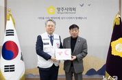 (뉴스핏 = 김수진 기자) 윤창철 양주시의회 의장은 29일 의장실에서 대한적십자사 경기도지사 우광호 사무처장에게 ‘2026년 적십자 특별회비’를 전달했다. 이날 전달식에는 대한적십자사 경기도지사 이계선 정기후원팀장, 나형진 북부봉사관장을 비롯해 대한적십자사봉사회 박주수 경기도협의회장과 정진수 양주시협의회장 등 9명이 참석했다. 특히, 윤창철 의장은 전달식을 마친 뒤 우광호 사무처장 등 적십자사 관계자들과 지역의 회비 모금 확대와 봉사활동 활성화 방안에 대해 의견을 교환했다. 양주시의회는 복지 사각지대에 놓인 취약계층을 지원하고 긴급재난구호와 공공의료, 국제협력 등 대한적십자사의 다양한 인도주의 활동에 동참하기 위해 매년 특별회비를 전달하고 있다. 이날 건넨 적십자회비는 위기에 처한 이재민과 저소득층 구호 사업, 사회봉사 사업, 지역 보건 및 혈액 사업 등에 쓰일 예정이다. 윤창철 의장은 “다양한 구호사업으로 숭고한 인도주의를 몸소 실천해 온 적십자 회원들의 노고에 항상 감사드린다”며 “양주시의회도 소외계층 지원 등 따뜻한 나눔문화 확산을 위해 지속적으로 노력하겠다”고 말했다.