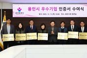 (뉴스핏 = 김수진 기자) 용인특례시는 11일 시청 접견실에서 ‘2025년 용인시 우수기업 인증제’ 심의 결과 선정된 ‘올해의 우수기업’ 10개 사에 인증서를 전달했다. 이상일 용인특례시장은 이들 기업 대표와 임직원들을 만나 축하와 격려 인사를 나누고 우수기업 인증서와 현판을 전달했다. 이상일 시장은 “우리 경제가 어려운 가운데서도 기업 활동을 잘 해주셔서 우수기업으로 선정된 것을 축하드린다”며 “각자 분야에서 그동안 많은 노하우를 쌓아왔기에 경제가 어려운 가운데서도 성과를 냈고, 우리 지역 경제에도 큰 보탬이 돼 주셔서 감사드린다”고 말했다. 이 시장은 “기업 활동으로 한 가족의 가장은 힘을 얻어 가정을 잘 꾸려갈 수 있고, 신규 일자리를 찾는 사람에게는 희망을 주셨다”며 “기업인들이 활동하실 수 있도록 환경을 잘 개선해 나갈 것”이라고 했다. 시는 매년 경영 실적, 기술·품질 경쟁력, 지역사회 기여도 등 다양한 지표를 종합 평가해 지역경제 발전에 기여한 중소기업을 우수기업으로 인증하고 있다. 올해 선정된 기업은 ▲㈜대성티엠씨 ▲신명이엔씨㈜ ▲주식회사 에이드로 ▲㈜에이치에스씨엠티 ▲주