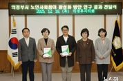 (뉴스핏 = 김수진 기자) 의정부시의회 ‘의정부시 노인사회참여 연구회’가 18일 연구용역 최종 결과를 집행부에 전달했다. 의정부시 노인사회참여 연구회는 조세일 대표의원과 김연균 의원, 정미영 의원으로 구성된 의원 연구단체로, 노인의 사회참여 현황과 효과를 분석하고 지역 맞춤형 정책 방안을 제시함으로써 노인의 삶의 질 향상과 세대 통합, 지역 공동체 회복을 위해 지난 5월부터 연구 활동을 돌입해 11월 연구 용역을 마쳤다. 연구회는 노인 관련 총괄 부서인 노인복지과에 노인의 사회참여 유형을 분류하고 방안을 제시하는 등에 대한 연구 결과를 토대로 작성된 연구용역 결과 보고서를 전달했다. 조세일 대표의원은 “이번 연구 결과를 바탕으로 담당부서와 협력하고 소통하여 노인사회참여 방안을 실체화하고 추진해 나갈 예정이다”라며, “고령사회 속에서 다양한 세대가 함께 공존할 수 있는 기반이 조성되길 바란다”라고 밝혔다.