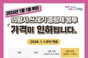 (뉴스핏 = 김수진 기자) 의왕시가 물가 상승 및 경기 침체로 인한 시민들의 경제적 부담을 완화하기 위해 2026년 1월 1일부터 쓰레기 종량제봉투 판매가격을 인하한다고 3일 밝혔다. 이번 가격 인하 대상은 일반용 및 재사용 종량제봉투이며, ▲5리터 봉투는 190원에서 150원으로 ▲10리터 봉투는 350원에서 300원으로 ▲20리터 봉투는 680원에서 550원으로 인하된다. 또한, ▲50리터 봉투는 1,700원에서 1,400원으로 ▲75리터 봉투는 2,630원에서 2,100원으로 각각 조정된다. 가격 인하 이전에 구매한 종량제봉투는 그대로 사용 가능하고, 음식물 종량제봉투, 공사장 생활폐기물 포대, 대형폐기물 신고필증은 가격 등은 변동 없다. 김성제 시장은 “종량제봉투는 시민 생활과 밀접한 만큼, 이번 가격 인하가 가계 부담 완화에 도움이 되길 바란다”며, “가격 인하 시점이 2026년 1월 1일이므로, 그전까지 각 가정에서 필요한 양만 구입해 주시길 바란다”고 전했다.