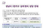 (뉴스핏 = 김호 기자) 성남시는 우울감이나 외로움, 불안감, 스트레스로 어려움을 겪는 1인 가구에 전문적인 심리·정서 상담을 지원한다고 5일 밝혔다. 이를 위해 최근 공모로 선정한 6곳 전문상담센터와 1인 가구 심리·정서 상담 수행에 관한 업무 협약을 했다. 협약한 상담센터는 △엠브레스 마인드 심리상담센터(분당구 구미동 소재) △온새미 심리상담센터(분당구 금곡동) △심리상담연구소 사람과 사람 위례점(수정구 창곡동) △㈜분당심리상담센터 아이엠미(분당구 야탑동) △속편한 심리상담센터(수정구 창곡동) △㈜마음꼭 차심리상담센터(분당구 야탑동)다. 이들 전문상담센터 이용 신청은 성남시 1인가구 힐링 스페이스(중원구 둔촌대로 100, 4층, ☏031-729-1756~9)나 거주지 동 행정복지센터 등에서 하면 된다. 성남시는 전문상담센터에서의 1인 가구 심리·정서 상담 지원을 위해 올해 5000만원의 사업비를 투입한다. 상담 지원 횟수는 최대 12회다. 1~8회 상담은 성남시가 비용(회당 4만~6만원)을 지원해 무료다. 나머지 9~12회 상담은 비용의 10%(4000~60