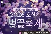 (뉴스핏 = 김수진 기자) 오산문화재단은 오는 4월 3일 오후 6시 30분 오산천 야외무대(종합운동장 뒤편)에서 시민들과 함께하는 봄맞이 ‘2026 오산천 벚꽃 축제’를 개최한다고 30일 밝혔다. 이번 행사는 따뜻한 봄의 시작을 알리며 시민들에게 특별한 추억을 선사하기 위해 마련된 것으로, 가수 황민호의 축하 공연을 비롯해 점등식과 폭죽 퍼포먼스가 어우러져 오산천 일대를 화려한 봄밤의 분위기로 물들일 예정이다. 행사 당일에는 음악과 빛, 불꽃이 조화를 이루는 다양한 프로그램이 진행되며, 남녀노소 누구나 함께 즐길 수 있는 열린 문화행사로 시민들의 큰 호응이 기대된다. 오산문화재단 관계자는 “오산천에서 펼쳐지는 이번 축제가 시민들에게 특별한 봄밤의 추억으로 남길 바란다”며 “앞으로도 시민들이 일상 가까이에서 문화와 예술을 향유할 수 있도록 다양한 프로그램을 지속적으로 마련하겠다”고 밝혔다.