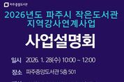 (뉴스핏 = 김호 기자) 파주시 중앙도서관은 지역의 작가, 예술가, 독서문화 활동가 등 인재를 발굴해 작은도서관의 독서문화 프로그램을 지원하는 녪년 작은도서관 지역강사 연계사업’에 참여할 지역강사를 모집한다. ‘작은도서관 지역강사 연계사업’은 2021년부터 추진하여 시민들이 작은도서관에서 지역의 작가, 예술가, 독서문화 활동가와 만나 다양한 독서문화 활동을 체험할 수 있도록 지원해 온 인기 사업이다. 특히 2025년에는 약 1,200명의 시민이 참여해 독서문화 확산과 작은도서관 운영 활성화에 크게 기여했다. 오는 28일 10시 중앙도서관에서 참여하고자 하는 강사들을 위해 모집 전 ‘강사 사업설명회’를 개최한다. 설명회에서는 사업 취지와 신청서 작성방법 등을 설명하여, 지역 작가, 예술가, 독서문화 등 다양한 역량을 가진 강사가 참여할 수 있도록 안내할 예정이다. 2026년도 지역강사 연계사업에 참여하여 강사로 활동하고자 하는 인재들은 오는 29일부터 2월 10일까지 신청서를 작성해 제출하면 된다. 또한, 2월 26일에는 서류심사를 통과한 강사를 대상으로 박람회 형식의 프로그램 설명회인 ‘지역강사박람