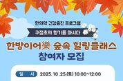 (뉴스핏 = 김수진 기자) 파주보건소는 시민들의 건강한 삶을 위한 한의약 건강 증진 프로그램인 ‘한방이어락(樂) 숲속 치유교실(힐링 클래스)’을 오는 25일 10시부터 12시까지 율곡수목원에서 운영한다. 이번 프로그램은 자연 속에서 가족이 함께 건강을 되돌아보고, 숲에서의 명상과 호흡을 통해 스트레스를 해소하고자 기획됐다. 참가자들은 수목원의 맑은 공기와 아름다운 풍경 속에서 지친 몸과 마음을 회복하는 시간을 갖게 된다. 주요 내용은 ▲구절초 숲길 산책 ▲자연 속에서 가족과 추억 만들기 ▲구절초 차 마시기 등 구절초를 주제로 한 다양한 활동으로 구성되어 있다. 신청은 파주시 평생교육포털 누리집(lll.paju.go.kr)을 통해 가능하며, 가족 단위로(4~6가구, 총 20여 명) 선착순 모집한다. 단, 신청 가구가 많을 경우 3대 가족을 우선 선발한다. 이한상 파주보건소장은 “자연과 함께하는 치유 프로그램을 통해 가족 간 유대감을 높이고, 건강한 생활 습관을 기를 수 있는 계기가 되길 바란다”라며 “많은 시민들의 적극적인 참여를 기대한다”라고 밝혔다.