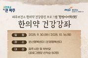 (뉴스핏 = 김수진 기자) 파주보건소는 시민들의 건강한 생활을 돕고 한의약에 대한 올바른 이해를 돕기 위해 ‘한의약 건강강좌’를 개최한다. 이번 강좌는 오는 9월과 10월 두 차례에 걸쳐 문산행복센터와 운정행복센터에서 진행된다. 첫 번째 강좌는 9월 30일 10시 문산행복센터 소공연장에서 열린다. ‘성장 한의약 교육’을 주제로, 김지훈 한방공중보건의와 동국대학교 일산한방병원 심영신 한의사가 강연에 나서 학부모와 시민들에게 성장 발달에 도움이 되는 한의약적 관리 방법을 소개한다. 두 번째 강좌는 10월 16일 13시 30분 운정행복센터 다목적홀에서 개최된다. ‘한방으로 건강한 겨울나기’를 주제로, 권해진 래소한의원 한의사가 강연하며, 환절기 면역력 강화와 겨울철 건강 관리에 유용한 한의약 정보를 전달할 예정이다. 이번 강좌는 파주시민 각 50명을 대상으로 포스터 내 정보 무늬(QR코드)를 통해 신청 가능하며, 강좌를 통해 생활 속에서 실천할 수 있는 한의약적 건강관리 방법을 배우는 기회가 될 것으로 기대된다. 이한상 파주보건소장은 “시민들이 쉽게 접근할 수 있는 한의약 강좌를 통해 건강에