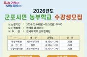 (뉴스핏 = 김수진 기자) 군포시 도시농업 활성화 지원사업 보조사업자인 한세대학교가 오는 3월 20일까지 2026년도 군포시민 농부학교 신규 수강생을 모집한다고 밝혔다. 군포시민 농부학교는 군포시민들이 도심 속에서 직접 작물을 재배하며 친환경적인 삶의 태도를 함양하고, 이웃과 소통하는 공동체 문화를 회복하기 위해 마련됐다. 특히 단순한 농사 기술 습득을 넘어 이론과 실습이 병행된 체계적인 커리큘럼을 제공할 예정이다. 올해 모집 규모는 성인반 25구좌, 주말가족반 25구좌, 주말어린이반 20구좌로 총 70구좌이며, 교육은 한세대학교 내 위치한 도시농업지원센터 전용 농장에서 진행된다. 운영 기간은 3월부터 12월까지 약 10개월간이며 총 20강에 걸쳐 절기별 작물 재배법과 생태 교육 등 다채로운 프로그램이 이어진다. 신청 접수는 3월 9일부터 3월 20일까지 진행되며 자세한 커리큘럼 및 접수 방법은 한세대학교 홈페이지 공지사항을 통해 확인할 수 있다. 군포시 관계자는 “도시농업은 먹거리를 생산하는 즐거움을 넘어 기후 위기 시대에 탄소 중립을 실천하는 소중한 발걸음이 될 것”이라며 “많은 시민이 흙을 만
