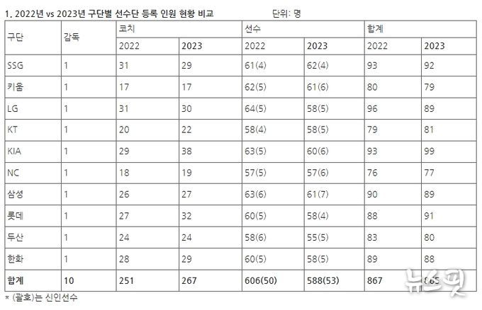 전체 소속 선수 등록 숫자는 지난해에 비해 감소했지만 코치는 16명 증가했다. 올해 등록된 코치는 총 267명이며 지난해에는 251명이 등록됐었다. KIA가 가장 많은 38명, 키움이 가장 적은 17명의 코치를 등록했다.