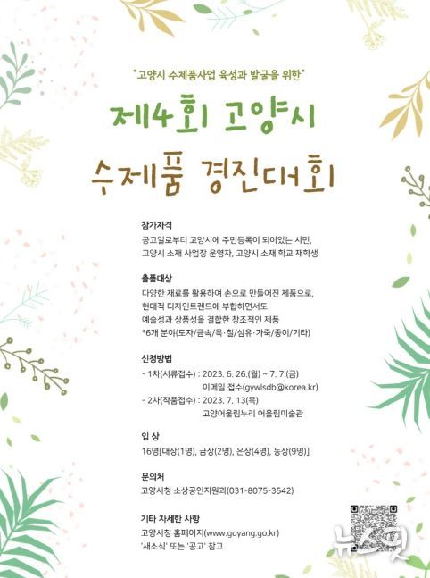 (뉴스핏 = 박선화 기자) 2023 제4회 고양시 수제품 경진대회가 열린다. 창조적이며 상품성 있는 지역 우수 수제품을 발굴하고, 수제품사업 육성을 위해 개최되는 고양시 수제품 경진대회는 올해로 4회를 맞이한다.