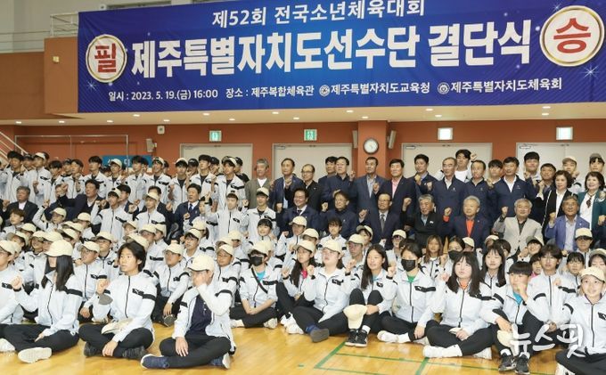 (뉴스핏 = 박선화 기자) 김희현 제주특별자치도 정무부지사가 19일 제52회 전국소년체육대회 도선수단 결단식에 참석해 체육인들의 노고에 감사를 표하고 대회 선전 결의를 다진다.