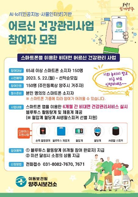 (뉴스핏 = 박선화 기자) 양주시보건소는 AI·IoT(인공지능·사물인터넷)기반으로한 ‘스마트폰 이용 비대면 어르신건강관리사업’ 참여자 접수를 진행하고 있다고 30일 밝혔다.