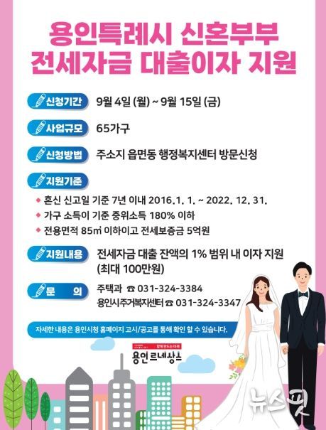 (뉴스핏 = 김호 기자) 용인특례시가 금융권으로부터 전세대출을 받은 지역 내 무주택 신혼부부를 대상으로 ‘전세자금 대출이자 지원사업’을 진행한다고 31일 밝혔다.
