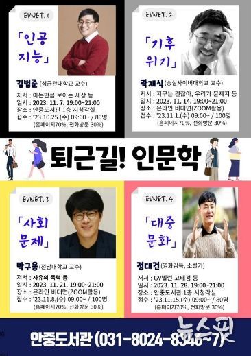 (뉴스핏 = 민선기 기자) 평택시립안중도서관은 11월에 야간 인문학 프로그램인 '퇴근길! 인문학'을 운영할 예정이다. 매주 화요일 저녁 7시~9시까지 진행되며 인공지능, 기후위기, 사회문제, 대중문화 등 요즘 쟁점이 되는 주제로 강연을 마련했다.