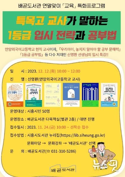 (뉴스핏 = 민선기 기자) 시흥시 곧도서관은 오는 12월 12일 도서관 내 다목적실에서 시민 50명을 대상으로 입시 및 공부법 전문가인 신영환 강사를 초대해 ‘특목고 교사가 말하는 1등급 입시전략과 공부법’ 특강을 운영한다.