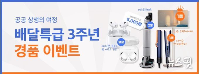 기한 내 이벤트에 참여한 소비자 중 1등에게는 ‘LG스탠바이미’를 증정한다. 2등 2명에는 ‘비스포크제트 청소기’, 3등 3명에는 ‘다이슨스트레이트너’가 마련됐다. 행운상 경품으로는 ‘에어팟 프로2’와 ‘갤럭시 버즈프로’가 각각 5개씩 마련됐다. 이밖에 아쉽게 경품을 놓친 소비자 중 2천 명을 추첨해 배달특급 5천원 할인쿠폰을 제공할 계획이다.