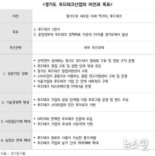 이에 연구원은 경기도가 스타트업 육성 위주의 푸드테크산업 발전 전략을 수립해 국내 푸드테크산업의 발전을 선도할 필요가 있다고 강조했다. 그러면서 ‘경기도의 새로운 미래 먹거리, 푸드테크’를 비전으로 하는 푸드테크 산업의 육성 방향 및 추진 전략을 제시했다.