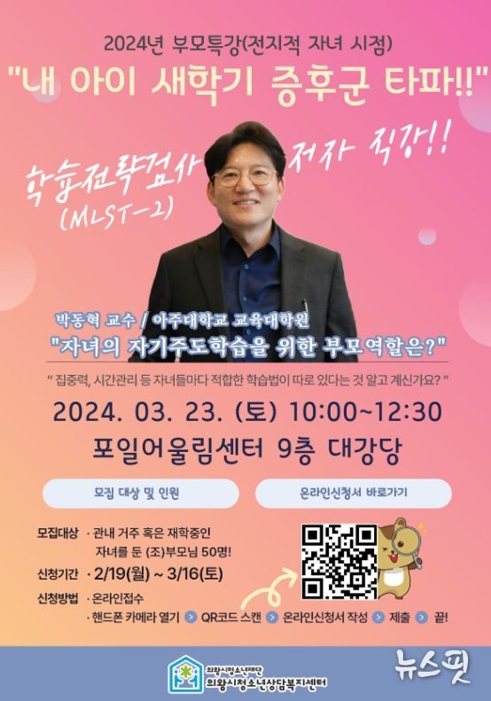 올해 첫 번째 특강인 ‘학습전략검사 저자 직강, 내 아이 새학기 증후군 타파’는 오는 3월 23일 토요일 10시 포일어울림센터 9층 대강당에서 진행된다.