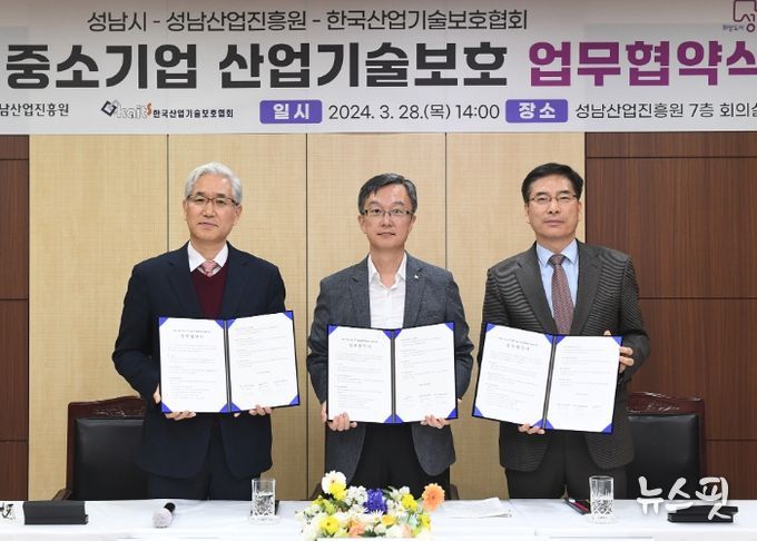 (뉴스핏 = 김수진 기자) 성남시가 28일 성남시 중소기업의 기술 유출 예방과 보호 체계 강화를 위해 한국산업기술보호협회, 성남산업진흥원과 ‘성남시 중소기업 산업기술보호 협력체계 구축’을 위한 업무협약을 체결했다.