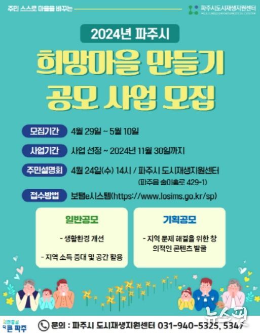 파주시 도시재생지원센터는 공모사업에 신청하고자 하는 마을주민협의체 또는 단체를 대상으로 4월 29일부터 5월 10일까지 사전상담을 통해 신청서 및 사업계획서 작성을 돕고, 보탬이(e)시스템 사용 등을 지원할 예정이다.