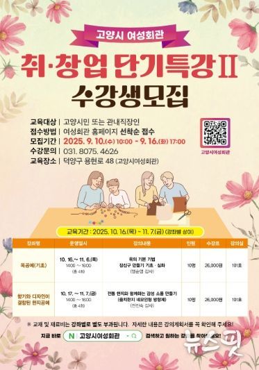 고양시민이라면 누구나 신청 가능하며, 수강생 모집은 9월 10일 오전 10시부터 9월 16일 오후 5시까지 7일간 누리집(홈페이지)으로 선착순 접수한다. 교재비와 재료비는 본인 부담이다.