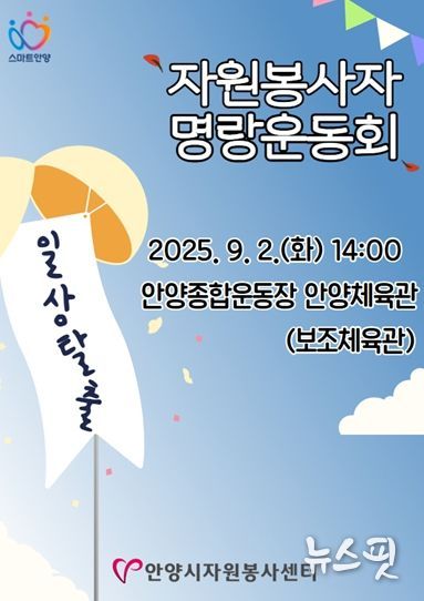 안양시자원봉사센터는 봉사자들의 노고에 감사하고, 봉사자 간 소통과 화합을 도모하기 위한 ‘일상탈출’자원봉사자 명랑운동회를 오는 9월 2일 오후 2시 안양종합운동장 보조체육관에서 개최한다고 28일 밝혔다.