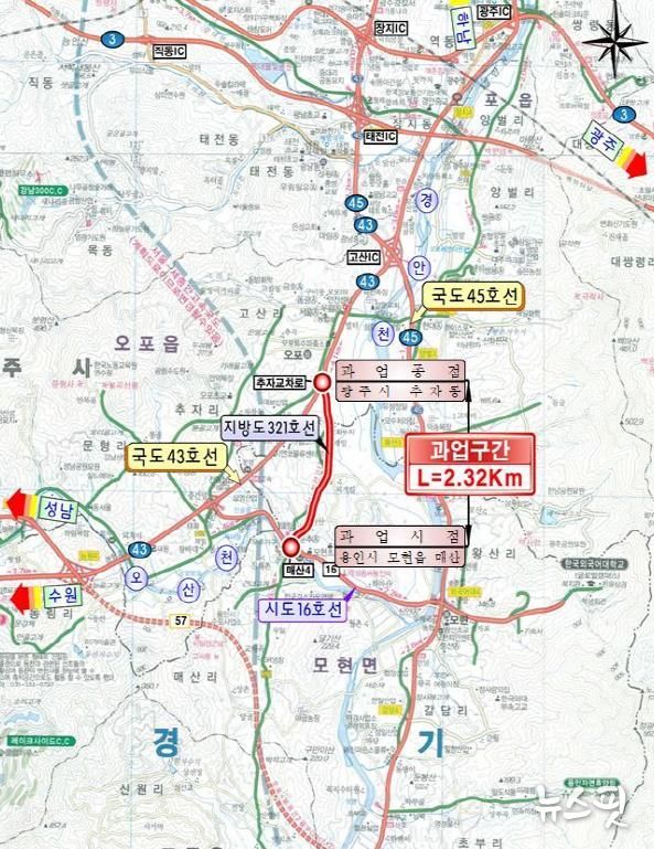 (뉴스핏 = 김수진 기자) 용인시 처인구 모현읍 매산리와 광주시 추자동을 연결하는 ‘지방도321호선 매산~일산간 도로 확포장공사’가 완료돼 25일 낮 12시부터 공식 개통한다.