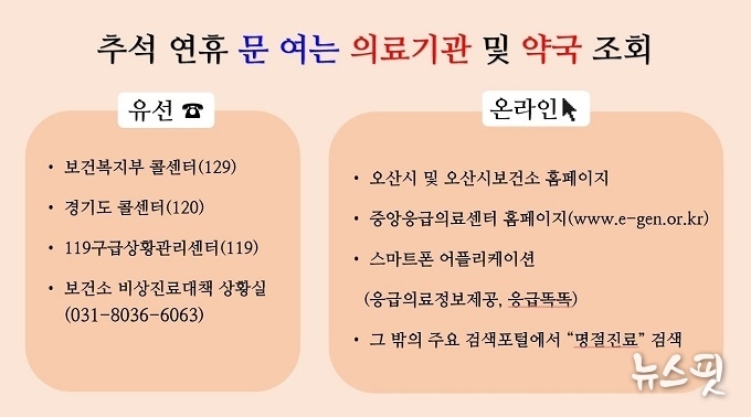 연휴 기간 동안 오산한국병원과 조은오산병원 응급실은 24시간 운영되며, 응급환자 발생 시 신속한 진료가 가능하다. 또 소아환자를 위한 달빛어린이병원(서울어린이병원, 웰봄병원)도 휴무 없이 오전 9시부터 오후 6시까지 진료를 이어가 아동 보호에 공백이 발생하지 않도록 할 예정이다.