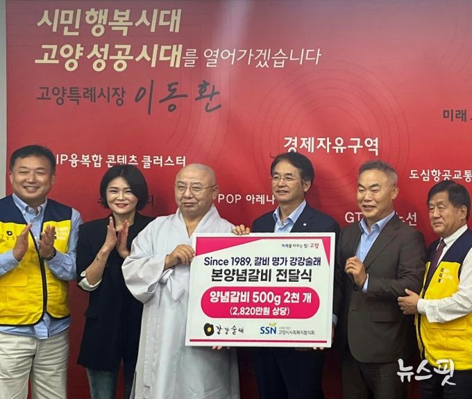 (뉴스핏 = 김수진 기자) ㈜전한의 외식브랜드 강강술래(대표 노상환)가 10월 10일, 고양특례시에 본양념갈비 500g 2,000개(2,820만 원 상당)를 기탁했다. 이번 전달식은 고양특례시청 열린시장실에서 진행됐으며, 이동환 고양특례시장, 김민숙 고양특례시의원(고양, 관산, 원신), 노상환 강강술래 대표, 김응화 고양시사회복지협의회 회장이 함께 자리했다.