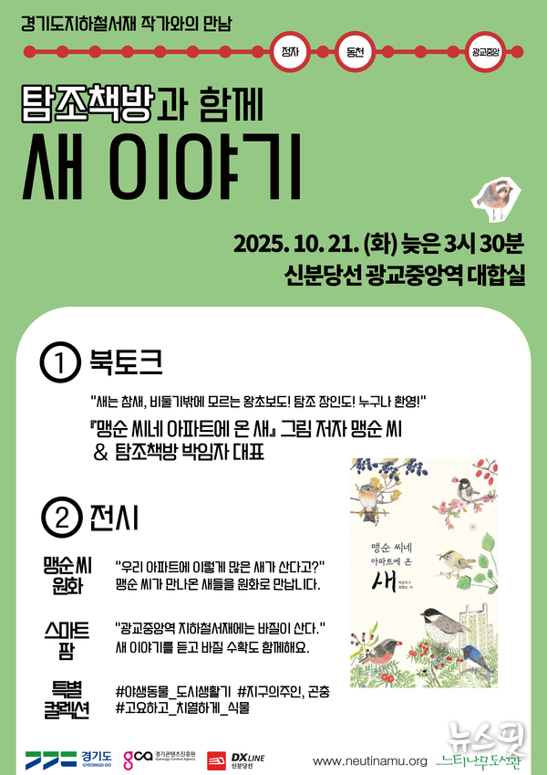 (뉴스핏 = 김수진 기자) 경기콘텐츠진흥원(원장 탁용석)과 느티나무재단(이사장 박영숙)은 오는 21일 오후 3시 30분부터 5시까지 신분당선 광교중앙역 대합실에 있는 지하철 서재에서 ‘탐조책방과 함께 새 이야기’ 북토크를 연다.