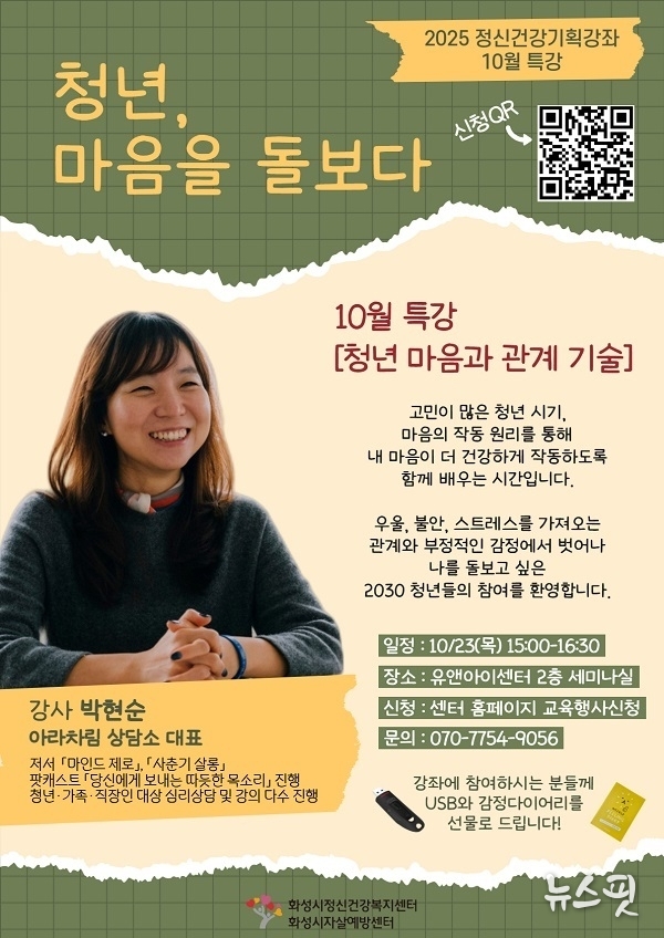 (뉴스핏 = 김수진 기자) 화성시정신건강복지센터가 오는 23일 오후3시 유앤아이센터에서 2025 정신건강 기획강좌 10월 특강 ‘청년, 마음을 돌보다’를 개최한다.
