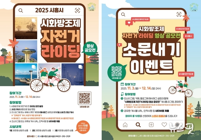 이번 공모전은 3일부터 0시부터 12월 14일 24시까지 진행되며, 전 국민 누구나 참여할 수 있다. 참가자는 시흥시 구간의 시화방조제 자전거도로를 달리는 장면을 20초 이내의 짧은 영상(인스타그램 릴스 또는 유튜브 숏츠)으로 제작해 누리소통망(인스타그램, 유튜브) 계정에 게시하면 된다.