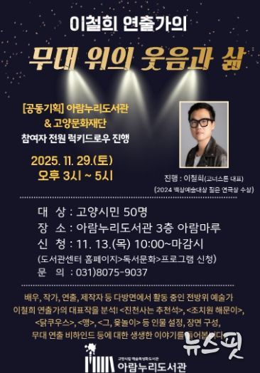 (뉴스핏 = 김수진 기자) 고양특례시 아람누리도서관은 오는 29일 오후 3시, 2024년 제60회 백상예술대상 젊은 연극상 수상자인 이철희 연출가를 초청해 예술특성화 프로그램 ‘무대 위의 웃음과 삶’을 운영한다.