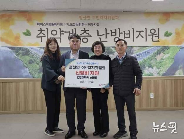이승구 청산면장은 “겨울철 난방 문제는 취약계층에게 큰 부담이 될 수 있다”며 “주민자치위원회의 따뜻한 기부로 실질적인 도움이 제공된 점에 깊이 감사드리며, 행정복지센터 또한 복지 사각지대 해소를 위해 지속적으로 점검하고 지원하겠다”고 밝혔다.