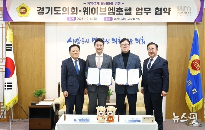 (뉴스핏 = 김수진 기자) 경기도의회(의장 김진경)는 4일 오후 의장 접견실에서 시흥 소재 웨이브엠 호텔(대표 천수봉)과 ‘도의원 및 직원 복지 증진과 지역 내 관광·숙박업 활성화를 위한 업무협약’을 체결했다.