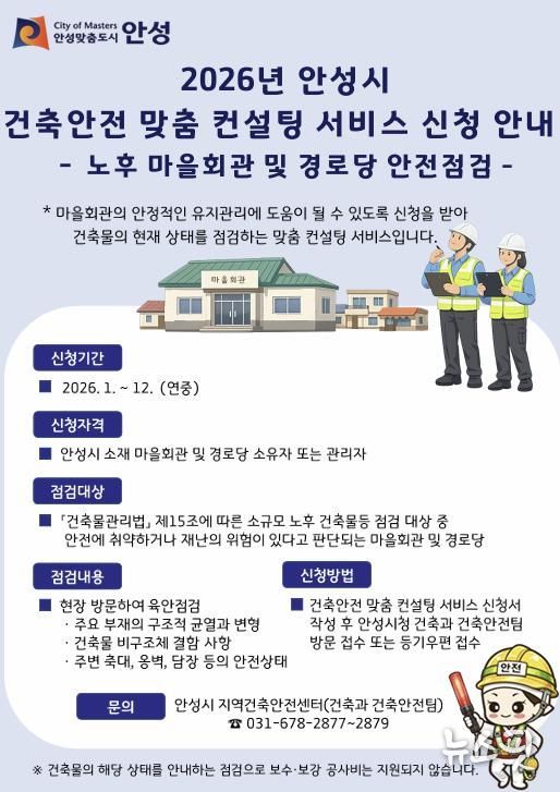 (뉴스핏 = 김수진 기자) 안성시는 올해 ‘건축안전 맞춤 컨설팅 서비스(노후 마을회관 및 경로당 안전점검)’를 시행한다고 23일 밝혔다.