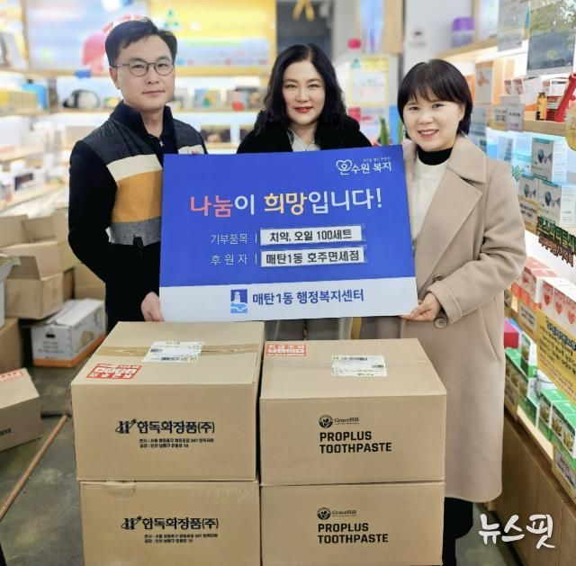 (뉴스핏 = 김호 기자) 수원시 영통구 매탄1동 행정복지센터는 지난 3일 호주면세점직영할인점 매탄점이 설 명절을 맞이해 매탄1동 행정복지센터에 프로폴리스 치약 100개, 오일 관절크림 100개를 후원했다고 밝혔다.