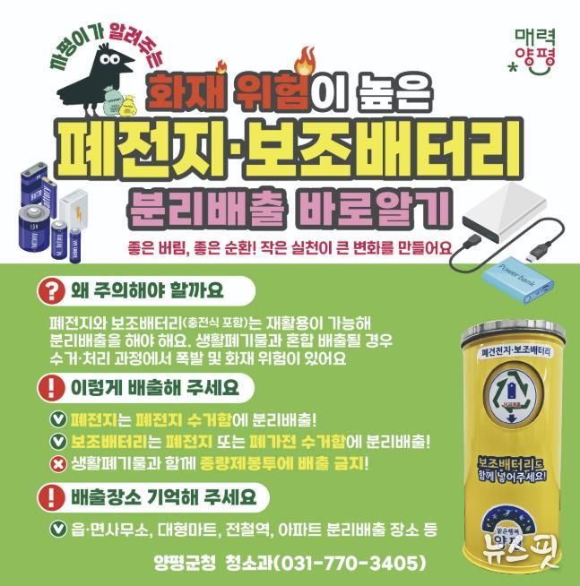 (뉴스핏 = 김호 기자) 양평군은 최근 보조배터리와 충전용 전지를 일반쓰레기로 배출해 수거·처리 과정에서 화재가 발생할 우려가 커짐에 따라, 해당 폐기물을 반드시 폐전지 수거함에 배출해 줄 것을 군민들에게 적극 홍보하고 있다고 4일 밝혔다.
