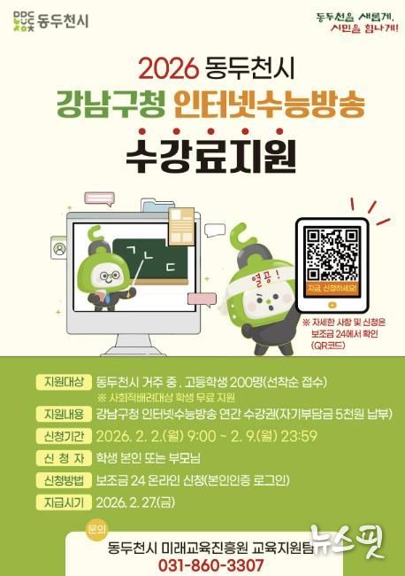 (뉴스핏 = 김호 기자) 동두천시는 사교육비 부담을 경감하고 교육 격차를 해소하기 위해 관내에 거주하는 중·고등학생을 대상으로 강남구청 인터넷수능방송 연간 수강료 지원 사업을 추진하고 있다.