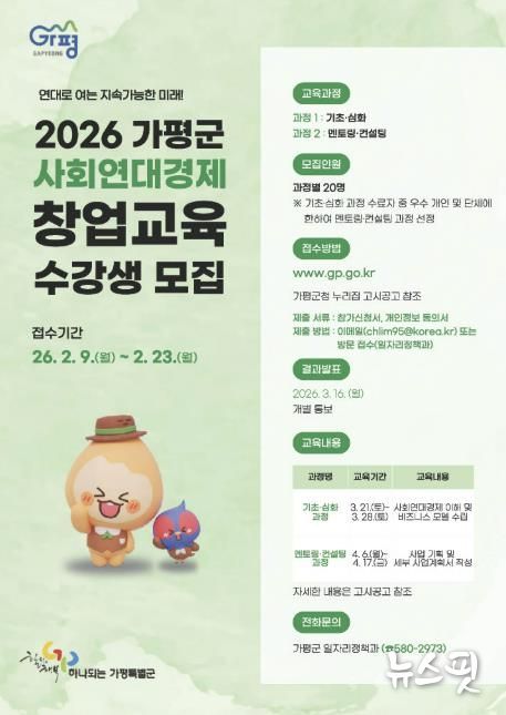군은 ‘2026년 사회연대경제 창업교육’ 수강생을 이달 9일부터 23일까지 각 과정별로 20명씩 모집한다고 10일 밝혔다. 이번 창업교육은 사회연대경제에 관심 있는 가평군민을 대상으로 하며, 3월 21일부터 4월 17일까지 총 8회에 걸쳐 진행된다.